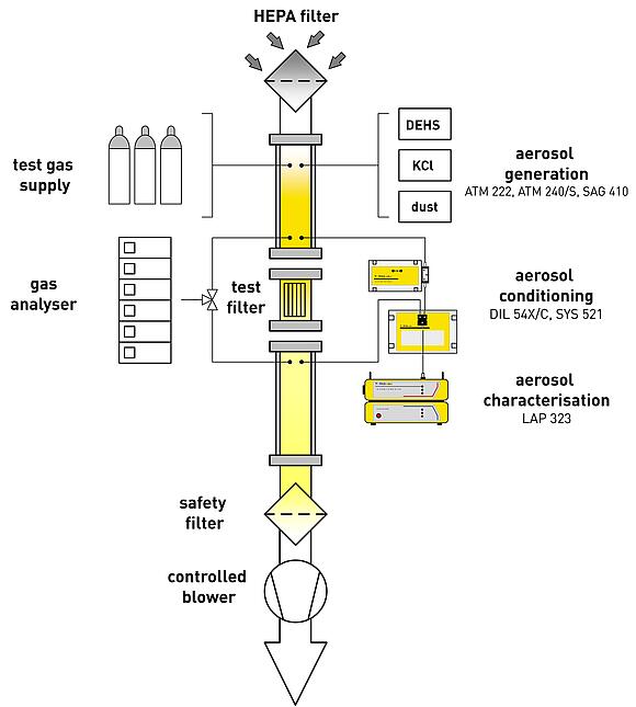 The test system FCT 113 for testing combination filters is based on established test system PAF 113. Air filter testing can be done with various types of particle-based test aerosols as well as different reference test gases.